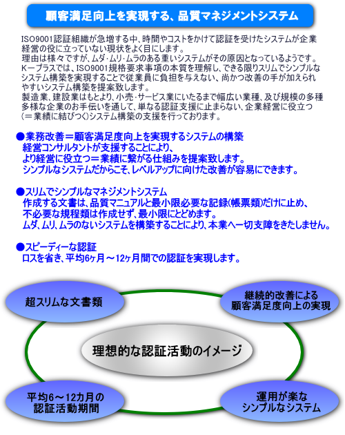 - ISO9001は、顧客満足度向上を実現する品質マネジメントシステムです。