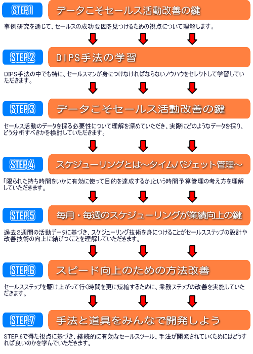 - 本プログラムは、ホワイトカラーの生産性向上手法『DIPS』をベースとし、K-プラスの営業力指導プログラムと融合させることによって、セールスマンの業務の効率化を図り、営業部隊の受注力を飛躍的に高めるプログラムです。